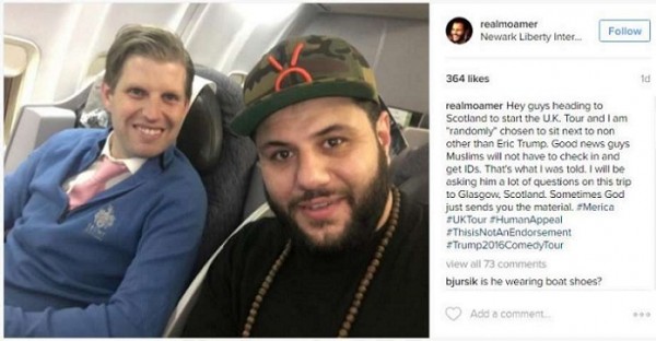 محمد عامر، كتب يوم الخميس في حساباته بمواقع التواصل، النص المنشورة صورته أدناه، وفيه أن اختياره تم عشوائياً، وهو في طريقه إلى جولة مسرحية في اسكتلندا، للجلوس (في الطائرة) بجانب Eric Trump وأخبر في النص أن لديه ما يسعد به المسلمين من أخبار، وهو أنهم “لن يكونوا ملزمين بحمل بطاقات هوية للدخول والخروج من الولايات المتحدة “وهذا ما قيل لي (يقصد ما قاله إريك له) وسألته كثيراً أثناء الرحلة إلى مدينة غلاسكو، باسكتلندا” منهياً ما كتبه بعبارة “الله يهيئ الأمور أحياناً” وفق تعبيره.