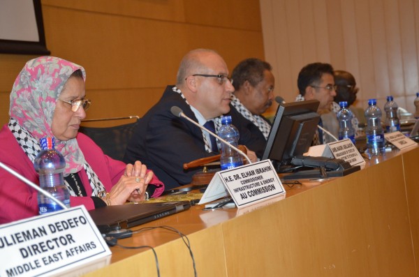 ثم بدأت الكلمات الافتتاحية بكلمة ممثلة الاتحاد الافريقي إلهام إبراهيم مفوضة الاتحاد الإفريقي لشؤون البنية التحتية والطاقة التي اكدت في كلمتها ان الاتحاد الافريقي ملتزم معنويا واخلاقيا بدعم حقوق الشعب الفلسطيني بالحرية واقامة الدولة وادانة الاستيطان ، وان دول الاتحاد الافريقي تصدر بيانا خاصا بفلسطين والشرق الاوسط يقدم في كل القمم الافريقية ويؤكد موقف الاتحاد الواضح تجاه ضرورة حل الصراع في الشرق الاوسط والتزام اسرائيل بقرارات الشرغية الدولية ذات الصلة.