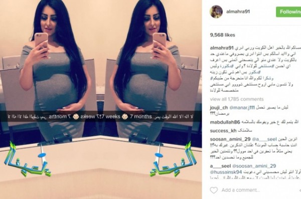 ونشرت المهرة صورتها عبر تطبيق "انستغرام" معلقةً: "مساكم الله بالخير أهل الكويت، وربي أدري إني وااايد أسالكم بس انتوا أدرى بظروفي ماعندي حد بالكويت ولا عندي منو الي ينصحني أتمنى بس أعرف أي أحسن مستشفي للولادة؟ وابي دكتورة وليس دكتور بس أهم شي تكون زينة.. وشكراً لكم والله أنا منحرجة من طيبكم ولا تنسون مابي أروح مستشفى شوووو ابي مستشفى متخصصة للولادة".