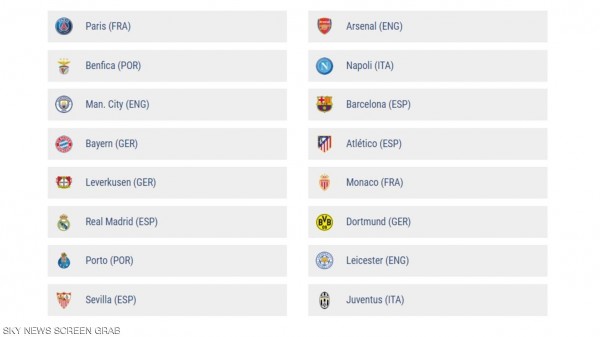 والفرق التي فازت في المراكز الأولى بالمجموعات الثمانية هي أرسنال وليستر سيتي الإنجليزيين، وأتلتيكو مدريد وبرشلونة الإسبانيين، وبروسيا دورتموند الألماني، ويوفنتوس ونابولي الإيطاليين، بالإضافة إلى موناكو الفرنسي.