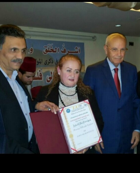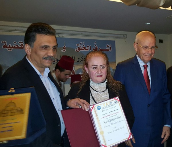و بهذه المناسبة كرمت مديرة المعهد العربي الاوروبي الدكتوره صباح الصالح كل من معالي الوزير الدكتور عبد الرحيم مراد ، و سفير فلسطين في لبنان ممثلا بالسيد خالد عبادي شهادة دكتوراه فخرية ، من المعهد العربي الاوروبي .