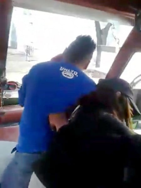 وتقول وسائل إعلام محلية مكسيكة إن الزوجة التي ترتدي قبعة بيسبول صعدت إلى الحافلة، لتجد عشيقة زوجها تجلس إلى جانبه، فما كان منها إلا أن هاجمتها وحاولت النيل منها.