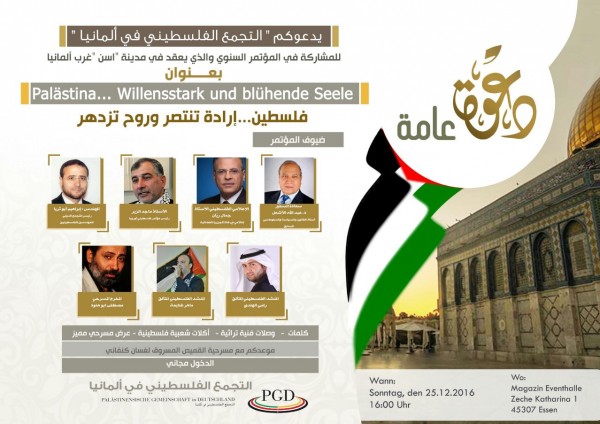 أعلن التجمع الفلسطيني في ألمانيا عن فعاليات مؤتمره السنوي الذي يقام يوم الأحد المقبل، ٢٥ كانون الأول/ ديسمبر الجاري، في مدينة إسن في غرب ألمانيا. ويلتئم المؤتمر تحت شعار "فلسطين .. إرادة تنتصر وروح تزدهر"، ويشمل فعاليات متنوعة تتناول تطورات القضية الفلسطينية وتفاعلاتها في الواقع الألماني.