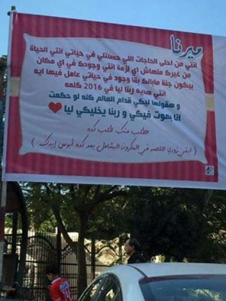 وعلق الرجل لافتة كبيرة وكتب فيها: "ميرنا إنتي أحلى الحاجات اللي حصلتلي في حياتي.. إنتي الحياة من غيرك ملهاش أي لازمة إنتي وجودك في أي مكان بيكون جنة مابالك بقا وجود في حياتي عامل فيها أيها.. إنتي هدية ربنا ليا في 2016.. كلمة وهقولها ليكي قدام العالم كله لو حكمت أنا بموت فيكي وربنا يخليكي ليا".