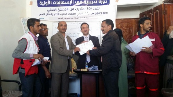 اختتمت الهلال الاحمر اليمني فرع محافظة صنعاء اليوم الدورة التدريبية في مجال الإسعافات الأولية بالتنسيق مع مكتب التربية والتعليم بالمحافظة بدعم وتمويل الاتحاد الدولي لجمعيات الهلال الاحمر والصليب الأحمر.
