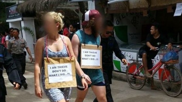 وتظهر الصور رجلا أجنبيا وسيدة يسيران إلى جانب ضباط شرطة في زيهم الرسمي في جزر جيلي تراوانغان، وقد علقت في رقبتيهما لافتة من الورق المقوى.