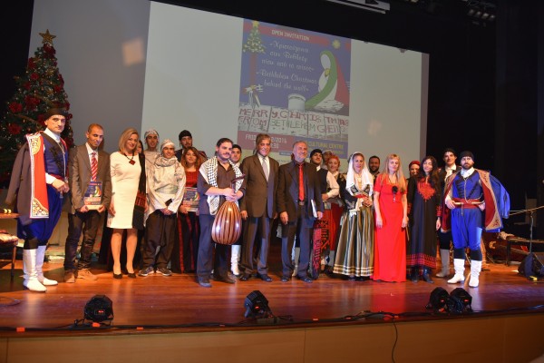 اقامت سفارة دولة فلسطين باليونان مهرجاناً سياسياً فنياً بعنوان "الميلاد في بيت لحم خلف الجدار"، وذلك يوم أمس في قاعة المركز الثقافي في أثينا، حضرة جمع غفير من اليونانيين والفلسطينيين وعدد من أبناء الجاليات العربية بحضور ممثلي عن الدولة والاحزاب اليونانية وعدد من سفراء الدول المعتمدين.