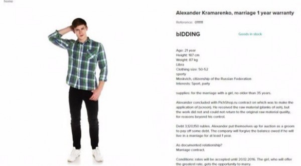 ونشر موقع بيشوب.آريو الروسي إعلاناً في الأسبوع الماضي، عرض فيه شاباً يدعى ألكسندر كرامارينكو (21 عاماً) للبيع للراغبات بالزواج منه، مع ضمان لمدة عام واحد. وحمل الإعلان وصفاً تفصيلياً للشاب، كالطول والوزن والعمر والبرج الفلكي والهوايات والاهتمامات، بالإضافة إلى صور له بالملابس الكاملة وعاري الصدر.