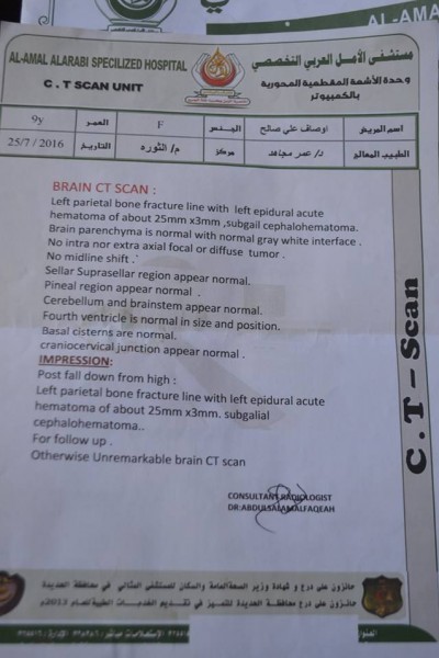 تعاني الطفلة أوصاف علي صالح أحمد من محافظة الحديدة والبالغة من العمر 9 سنوات من ضمور في الدماغ ونزيف داخلي في الجمجمة منذ أن سقطت من أعلى منزلها الى الأسفل مما أحدث لها المعاناة والالام في الرأس ، الأمر الذي يهدد حياتها يوميا" بسبب عدم قدرة أسرتها لعلاجها وعمل الأشعة المقطعية لها.
