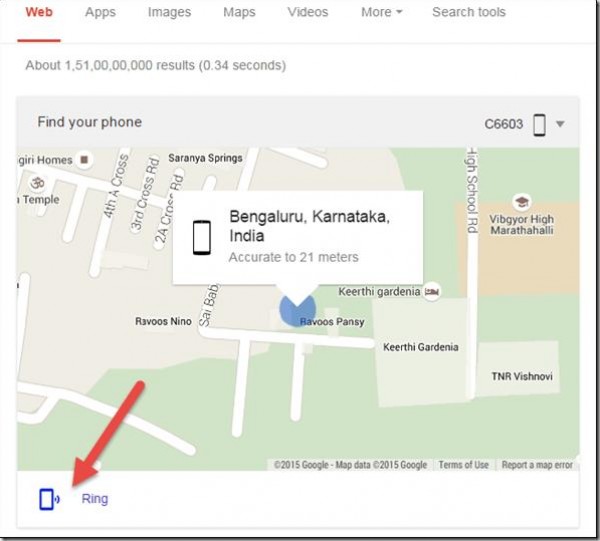 الآن عندما تريد العثور على هاتفك، افتح جوجل وقم بتسجيل الدخول باستخدام بياناتك، وسوف ترى صورة صغيرة على الصفحة معها خريطة مصغرة، يمكنها تحديد موقع هاتفك، كما يجعله يرن لمدة خمس دقائق.