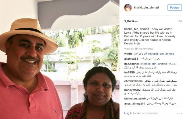 توالت تعليقات الإعجاب من ناشطين على موقع التواصل الاجتماعي انستغرام، مثمنة صورة نشرها وزير الخارجية البحريني، خالد بن أحمد بن محمد آل خليفة، التقطت له لدى زيارته منزل مدبرة بيته، في منزلها بكوراما كيرالا بالهند.