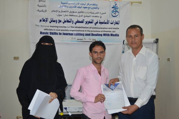 اختتم مركز أبجد للدراسات والتنمية بمحافظة ذمار، الدورة التدريبية الثانية الخاصة بمسؤولي الإعلام والاتصال في منظمات المجتمع المدني بذمار حول المهارات الاساسية في التحرير الصحفي والتعامل مع وسائل الإعلام, والتي استمرت اربعة أيام.