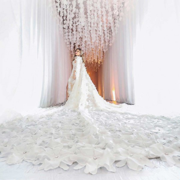 فقد اعتمدت العروس ليومها الكبير فستاناً فريداً من تصميم جان لويس ساباتيي، تميز بقصّته الضيقة وشقّه العالي بالإضافة إلى كاب طويل مطرّز بالورود.