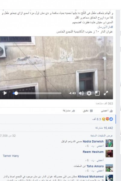 وقالت المواطنة التي صوّرت الفيديو وتدعى أميرة عبد اللطيف في تدوينة لها على موقع فيسبوك: "... للأيتام في التجمع الخامس وده يا جماعة من شباك أوضتي الساعة 7 ونص الصبح، والهانم بتعاقب طفل في التلج ده بأنها تحميه بمياه ساقعة، ودي مش أول مرة أسمع إزاي بيعذبوا الأطفال، وكذا مرة أروح اتخانق معاهم وأكلم المديرة ومفيش فايدة، فقررت أفضحهم".