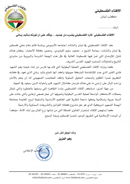 كما وبارك الإفتاء الفلسطيني العملية البطولية التي قام بها فارس من أبناء شعبنا وهو الشهيد فادي القنبر الذي جدد للإنتفاضة المباركة حيويتها وأكد انها تتمتع بتأيد رباني الذي تعهد في كتابه الكريم نصرة المظلوم وأصحاب الحقوق المسلوبة وأكد للمغتصب الصهيوني أنه لن ينعم بالامان وراحت البال على ارضي ما بقي هناك فرسان كأمثال الشهيد قنبر وأخوانه الذين سبقوه في الجهاد.