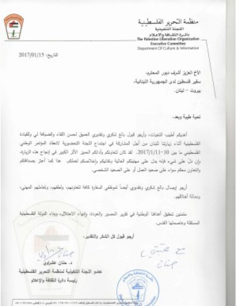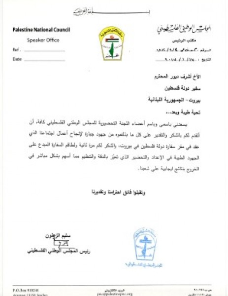 تلقى سفير دولة فلسطين لدى الجمهورية اللبنانية اشرف دبور، اليوم الثلاثاء، رسائل شكر من رئيس المجلس الوطني الفلسطيني سليم الزعنون وعضو اللجنة التنفيذية لمنظمة التحرير الفلسطينية د. حنان عشراوي على نجاح اجتماعات اللجنة التحضيرية للمجلس الوطني الفلسطيني التي انعقدت في مقر سفارة فلسطين في العاشر والحادي عشر من الشهر الجاري.