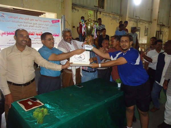 كرم اليوم وكيل أول محافظة الحديدة الأستاذ / محمد عياش قحيم ومعه رئيس جامعة الحديدة الأستاذ الدكتور / أحمد محمد هادي دغار ومدير مكتب الشباب والرياضة بالمحافظة الأستاذ/ إسماعيل الرباط ونائب رئيس الإتحاد اليمني لكرة القدم الأستاذ / حسن باشنفرومشرف عام البطولة عميد كلية التربية البدنية والرياضية الدكتور / خالد البرعي أبطال بطولة كرة اليد لأندية الحديدة لفئة العموميوالتي نظمها إتحاد كرة اليد فرع الحديدة بالتنسيق مع الإتحاد العام للعبة للفترة 15ــ21 يناير الجاري وتحت شعار " رياضيون يداً بيد من أجل بناء الوطن ".