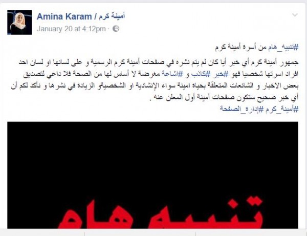 كما علقت عبر صفحتها الرسمية بموقع فايسبوك، كاتبة: “#تنبيه_هام من أسرة أمينة كرم