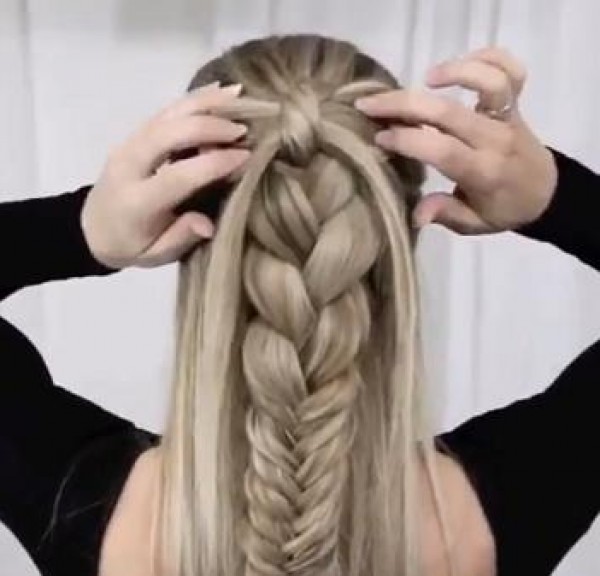 ابدأى بتصفيف شعرك للخلف، وقومى بتقسيمه إلى نصفين، بحيث يكون الجزء العلوى أقل نسبياً من السفلى، وبمنتصف الرأس قومى بعمل ضفيرة عريضة وباستخدام خصلتين من الجانبين قومى بربطهم بشكل "فيونكة"، واستخدمى "بنس الشعر" للحفاظ على وضعيته تلك، و لكى تضمنى بقاء تصفيفة شعرك منسقة لأطول وقت ممكن قومى بوضع سبراى مثبت للشعر.
