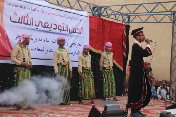الطالب الخريج عبدالله بخضر شارك بأنشودة بعنوان التخرج شاركت خلالها فرقة نجوم حضرموت برقصة شعبية.