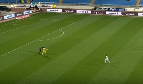 وحاول الحارس الشبابي أن يراوغ مهاجم التعاون، ولكن قام الأخير بخطف اللكرة منه، واهدائها لزميله ليحرز هدف بعد هذا الخطأ الجسيم للحارس، الذي تسبب بهزيمة فريقه بهدفين.