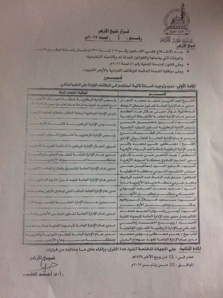 كان فضيلة الامام الأكبر الدكتور أحمد الطيب شيخ الأزهر الشريف قد أصدر قرارا رقم 1 لسنة 2017 بترقية الدكتور عبد الناصر حسن قناوي مديرًا عامًا للإدارة العامة للعلوم الدينية والعربية لمنطقة أسيوط الأزهرية وتعيينه رئيسا للمنطقة الازهرية بأسيوط بدلا من الشيخ احمد عبد العظيم عمرو .