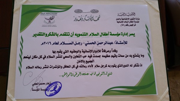 كرمت مؤسسه اطفال السلام الانسانية بأمانة العاصمه الأخ / عبدالرحمن الحسني وكيل قطاع الشباب بوزاره الشباب والرياضه كرجل للسلام للعام 2016.