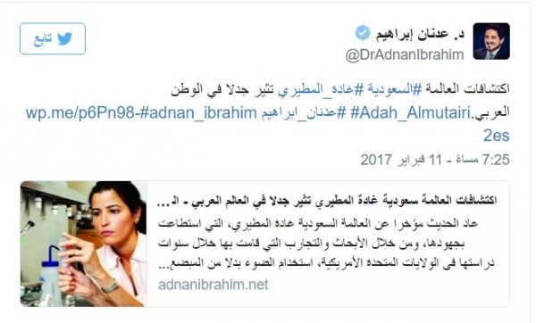ودافع إبراهيم عبر مقال نشر رابطه في تويتر: "إن الطب اليوم سيكون غير الطب الذي نعرفه قبل المطيري.. عندما تصفحنا موقع التواصل الاجتماعي لنعرف عدد متابعي أبحاث واكتشافات هذه العالمة العربية تبين أن هناك 2000 مشاهدة أو 3000 مشاهدة لكل الفيديوهات التي تتحدث عن إنجازاتها وبعض التعليقات تتحدث من قبيل: تبا لعلمها.. تبا لاختراعاتها. أين نقابها؟ أين حجابها؟"