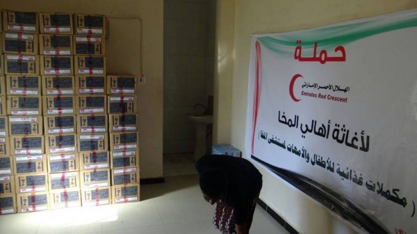 سير الهلال الأحمر الإماراتي صباح اليوم قافلة مساعدات كبيرة تكونت من 20 شاحنة شملت (مواد غذائية، تمور، بطانيات، خيم) تم توزيعها على السكان وسط الشارع العام لمدينة المخا.