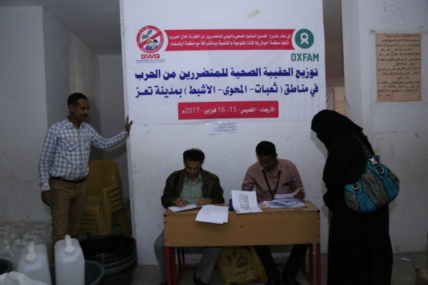 دشنت منظمة أجيال بلا قات للتوعية والتنمية وبالشراكة مع منظمة أوكسفام اليوم الأربعاء 15- فبراير 2017م توزيع 500 حقيبة صحية للمتضررين من الحرب في مدينة تعــز.
