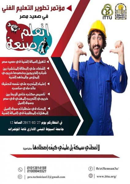 تشهد جامعة أسيوط الاثنين القادم انطلاق فعاليات المؤتمر الأول لتطوير التعليم الفني في صعيد مصر بعنوان "اتعلم صنعة ", والذي تنظمه وحدة نقل التكنولوجيا المتكاملة بالجامعة تحت رعاية المهندس ياسر الدسوقي محافظ أسيوط , والدكتور أحمد عبده جعيص رئيس الجامعة ,والدكتور عصام زناتي نائبه لشئون التعليم والطلاب, وبمشاركة لفيف من الأساتذة والمتخصصين من مختلف كليات الجامعة ومن وزارة التربية والتعليم وقطاع التعليم الفني , وكذلك نحو 500 مشاركاً من طلاب المدارس والمعاهد الفنية ومن طلاب الجامعة وخريجيها.