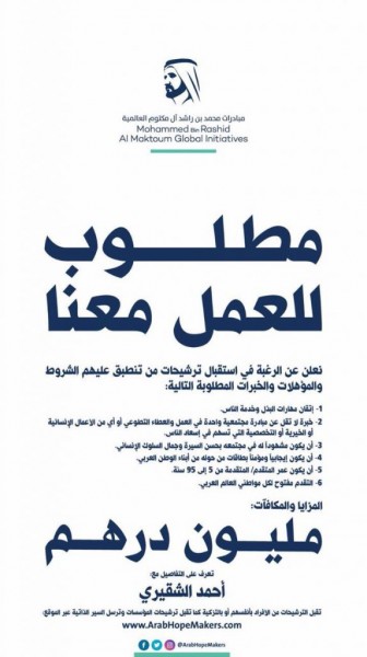 بعد وزير السعادة، أعلن حاكم دبي أعلن الشيخ محمد بن راشد آل مكتوم عن أغرب وظيفة قد تتخيلها وهي "صناعة الأمل".ودوّن عبر حسابه الرسمي في "تويتر": "نبحث عن صناع الأمل في عالمنا العربي"، مرفقاً التغريدة بالإعلان الوظيفي الذي تضمن شروط تلك الوظيفة ومزاياها ومكافآتها.