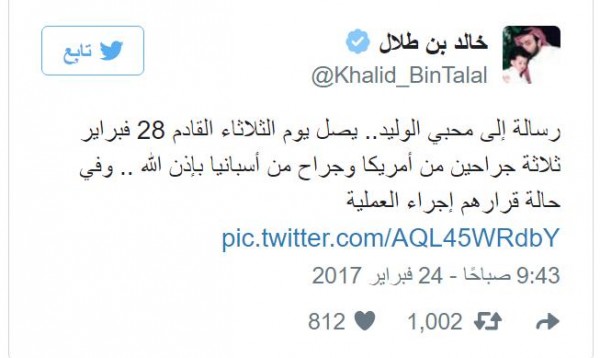 كشف الأمير خالد بن طلال أن فريق أطباء مكون من 3 جراحين أمريكيين وجراح إسباني سيصلون إلى المملكة العربية السعودية، اليوم الثلاثاء ، للوقوف على الحالة الصحية لنجله الأمير الوليد.