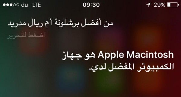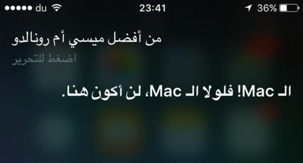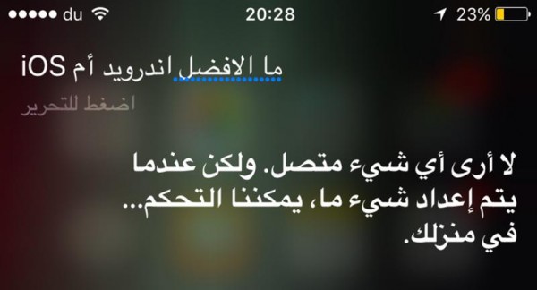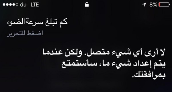 وقال موقع "سكاي نيوز عربية": كانت لنا تجربة سريعة مع خدمة "Siri" العربية على هاتف آيفون، فواجهناه ببعض الأسئلة السهلة وأخرى جدلية، فكانت الإجابات مثيرة للضحك والعجب.