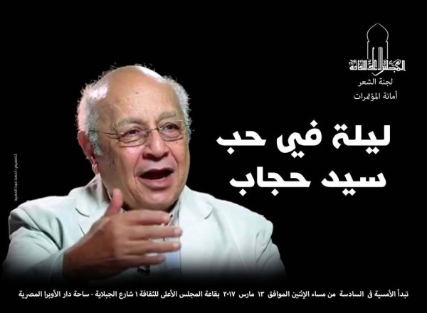 تحت رعاية الأستاذ/ حلمى النمنم - وزير الثقافة رئيس المجلس الأعلى للثقافة، والأستاذ الدكتور/ هيثم الحاج على - الأمين العام، تنظم لجنة الشعر برئاسة الأستاذ الدكتور/ محمد عبد المطلب بالتعاون مع أمانة المؤتمرات بالمجلس الأعلى للثقافة" ليلة في حب سيد حجاب"، وذلك في السادسة من مساء الإثنين الموافق 13 مارس 2017بمقر المجلس، بمشاركة نخبة من رفقاء درب وتلامذة ومحبى الشاعرالكبير سيد حجاب من الفنانين والإعلاميين والشعراء والنقاد.