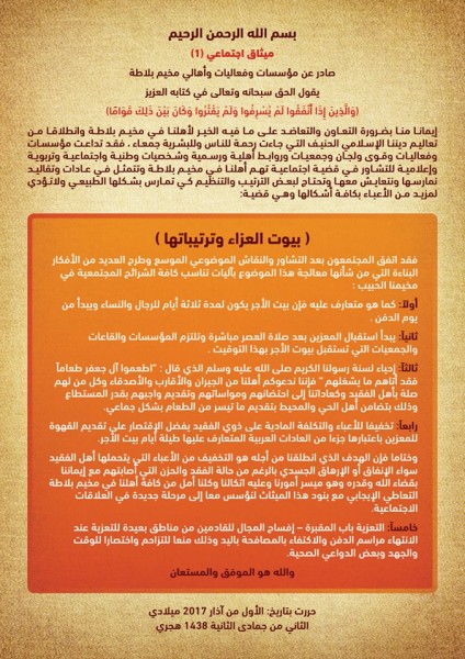 وكانت مؤسسات وقوى ولجان وجمعيات وروابط أهلية ورسمية وشخصيات وطنية واجتماعية وتربوية وإعلامية، قد تداعت للتشاور في قضية اجتماعية تهم أهالي مخيم بلاطة، وتتمثل في عادات وتقاليد نمارسها ونتعايش معها وتحتاج لبعض الترتيب والتنظيم كي تمارس بشكلها الطبيعي، ولا تؤدي لمزيد من الأعباء بكل أشكالها، وتتمثل هذه القضية الاجتماعية في بيوت العزاء وترتيباتها.