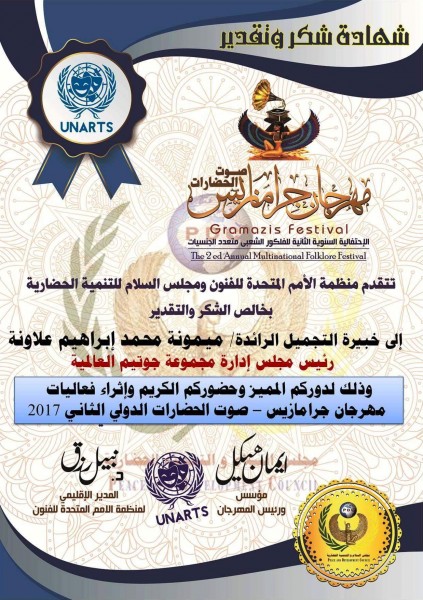 منظمة الأمم المتحدة للفنون ومجلس السلام تكرم ميمونة علاونه