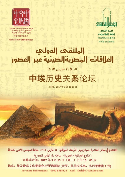تحت رعاية الأستاذ/ حلمى النمنم- وزير الثقافة، والأستاذ الدكتور/ هيثم الحاج على - الأمين العام للمجلس الأعلى للثقافة، والدكتورة / زبيدة عطا - مقررة لجنة التاريخ، ينظم المجلس الأعلى للثقافة بالتعاون مع المركز الثقافي الصيني بالقاهرة ملتقى دولي بعنوان" العلاقات المصرية الصينية عبر العصور "، ويبدأ في العاشرة من صباح يوم الأربعاء الموافق 15 مارس الجارى ويستمر على مدار يومين، بمشاركة عدد كبير من الباحثين والمتخصصين الصينين والمصريين.