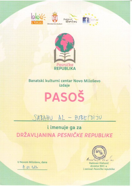 منح الشاعر العراقي المغترب صباح سعيد الزبيدي المقيم في بلغراد عاصمة صربيا المواطنة لجمهورية الشعر والتي أسسها الشاعر الصربي رادوفان فلاهوفيتش مؤسس ومدير مركز باناتسكي الثقافي في مدينة نوفو ميلوشيفو الصربية .