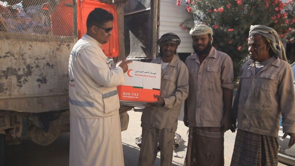 الهلال الإماراتي يوزع مساعدات إنسانية لعمال النظافة بحضرموت