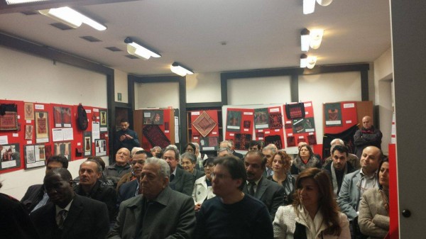 وأتشحت القاعة بالمطرزات الفلسطينية مع شرح لكل لوحة تطريز من إعداد جمعية النجدة الاجتماعية الايطالية والتي تخصص ريع مبيعاتها إلى أطفال المخيمات في لبنان .