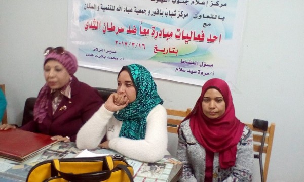 نظم مركز أعلام جنوب أسيوط أحد لقاءات مبادرة معًا ضد سرطان الثدى وذلك بمركز شباب باقور والتى حاضرت به أستاذ دكتور منـى المهدي الأستاذ/ بكلية الصيدلة جامعة أسيوط, وعضو نقابة الصيادلة, وعضو منظمة الصحة العالمية صرحت بذلك مروه سيد مسئول الرأى العام بمركز أعلام جنوب أسيوط حيث أشارة إلى أن اللقاء يأتى ضمن سلسلة لقاءات توعوية بسبل الوقاية والاكتشاف المبكر ويذكر أن المبادرة تستهدف توعية 3000 سيدة بالقرى والمناطق العشوائية وذلك بالتعاون مع الصحة نقابة الصيادلة المجلس القومى للأمومة والطفولة الوحدة المحلية القطاع الاهلى بأبوتيج وصدفا مؤكده على أن المبادرة وتأتى فى إطار تبنى الهيئة العامة للاستعلامات لقضايا المرآة والطفل حضر اللقاء عدد كبير من سيدات القرية.