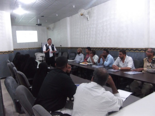 يقوم بعملية التدريب مسئول التدريب والترويج الصحي بالمنظمة/صلاح الدين علي إبراهيم، لمادة بعنوان(دليل الإسعافات الأولية)، من إعداد د. فؤاد محمد حسن – مسئول التدريب في جمعية الهلال الأحمر اليمني، الذي افتتح التدريب بتقديم نبذة تعريفية عن المنظمة الدولية للهجرة، أنشطتها وأهدافها.