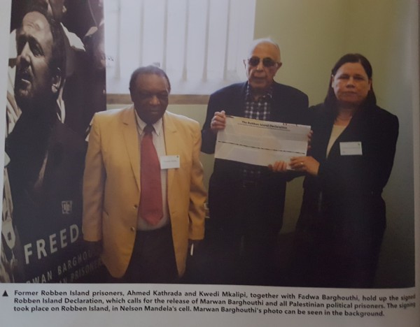 وقالت: "إن شعبنا الفلسطيني الذي لازال يعاني من الاحتلال البغيض والظلم والعنصرية الاسرائيلية يقدر عاليا الدور القوي والمميز الذي لعبه أحمد كاثرادا لدعم حرية الاسرى والمعتقليين الفلسطينين وخاصة إطلاق حملة الحرية للأخ المناضل مروان البرغوثي وكافة المعتقلين والاسرى عام 2013 من زنزانة القائد الكبير نلسون مانديلا".