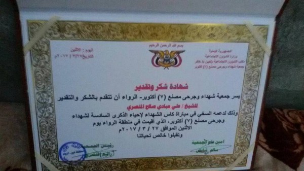 تقدمت السلطة المحلية واللجنة المنظمة لدوري شهداء وجرحى مصنع 7 أكتوبر بمديرية خنفر بالشكر الجزيل لرجل الاعمال الشيخ علي عبادي المنصري على تكفله بدعم دوري الشهداء الكروي الذي أقيم بمديرية خنفر وتكلل بالنجاح.