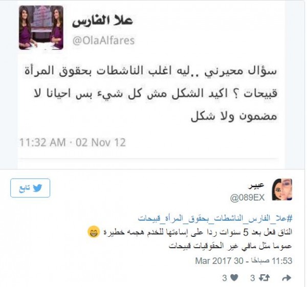 "علا الفارس الناشطات بحقوق المرأة قبيحات "على موقع "تويتر"، وأكدت"عبير" تفعيل الهاشتاغ، ردا على إساءتها للخدم، إذ علقت: "التاق فعل بعد 5 سنوات ردا على إساءتها للخدم هجمة خطيرة عموما مثل مافي غير الحقوقيات قبيحات".