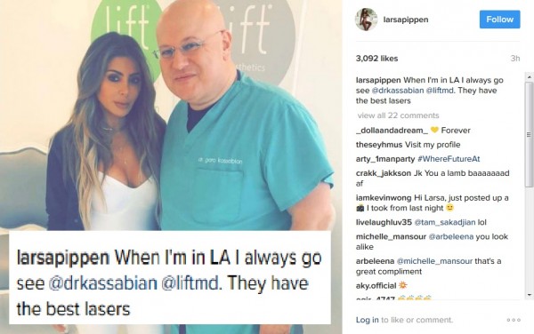 السيدتان وثّقتا يومهما الطويل عبر صفحاتهما على وسائل التواصل الإجتماعي، وقد أعلنتا قيامهما بزيارة إلى طبيب تجميل المشاهير في هوليوود، اللبناني الأصل د. كارو كسابيان في مستشفاه الخاصّة في بيفرلي هيلز Lift MD Aesthetics، والموجودة هُناكَ منذ ثمانية عشر عاماً، حيثُ كتبت لارسا في تعليق على صورتها مع الدكتور عبر صفحتها على الإنستغرام: "حين أكون في لوس أنجلوس أذهب لزيارة د. كاسابيان، لديهم أفضل تقنيات الليزر". أما كورتني كارديشيان، فاختارت أن توثّق الزيارة عبر صفحتها على السناب شات، مع العلم أن هذه ليسَت المرة الأولى التي تأتمن فيها جميلات آل كارديشيان د. كارو على بريقهنّ، الذي يُساوي الملايين، فـ كيم أيضاً من الزبونات الدائمات لمستشفى د. كاسابيان.