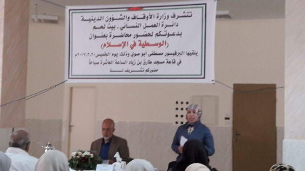 نظمت دائرة العمل النسائي في بيت لحم محاضرة دينية تحت عنوان الوسطية في الاسلام القاها البروفسور مصطفى ابو صوي أستاذ الكرسي المكتمل لدراسة فكر الإمام الغزالي ومنهجه في المسجد الأقصى المبارك، وجامعة القدس) مبينا تاريخ امتنا المجيدة التي امتازت بها عن غيرها من الأمم بأنها أمة بالوسطية والاعتدال بعيداً عن التطرف والانحراف ، وهدى الله هذه الأمة لما فيه الحق باذنة فكان منهاجاً مثالاً في الاستقامة والاعتدال.