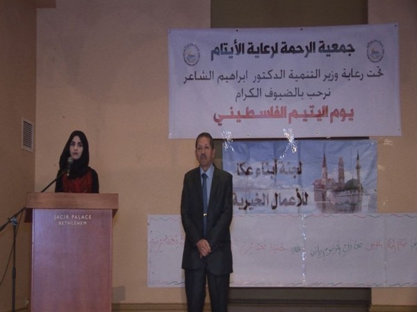 نظمت جمعية الرحمة للايتام في بيت لحم حفلا تكريميا للاطفال الايتام بمناسبة يوم اليتيم الفلسطيني تحت رعاية وزير التنمية الاجتماعية في فندق قصر جاسر بمدينة وبشراكة ودعم من مجموعة حمودة الاستثمارية – حمودة للابان والمواد الغذائية ولجنة ابناء عكا للاعمال الخيرية في اطار فعاليات الجمعية لادخال الفرحة الىق قلوب الايتام