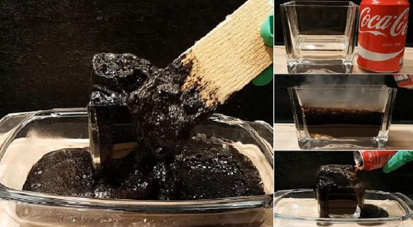 ويُظهر الفيديو كوبًا به سائل يشبه المادة الحمضية الموجودة بالمعدة، وبعدها يتم سكب شراب الكوكا، وفي الحال تتكون مادة غازية وتتضخَّم، كما يتصاعد منها الغاز، وينتهي التفاعل بهذه الكتلة وقد تحولت إلى مادة صلبة سوداء تشبه أسفلت الطريق، لا يجب أن تكون داخل معدة الإنسان؛ حسب "مولتن ساينس".
